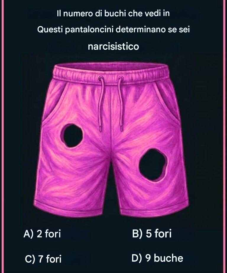 A prima vista, questa immagine virale sembra essere niente più che un semplice paio di pantaloncini strappati. Ma non appena si legge il titolo – « Il numero di buchi che vedi in questi pantaloncini determina se sei un narcisista » – il cervello passa immediatamente dallo scorrimento passivo alla modalità analitica. Ed è proprio per questo che questo enigma visivo ha preso il sopravvento sui social media: sfida la nostra percezione e allo stesso tempo dà una piccola spinta al nostro ego.