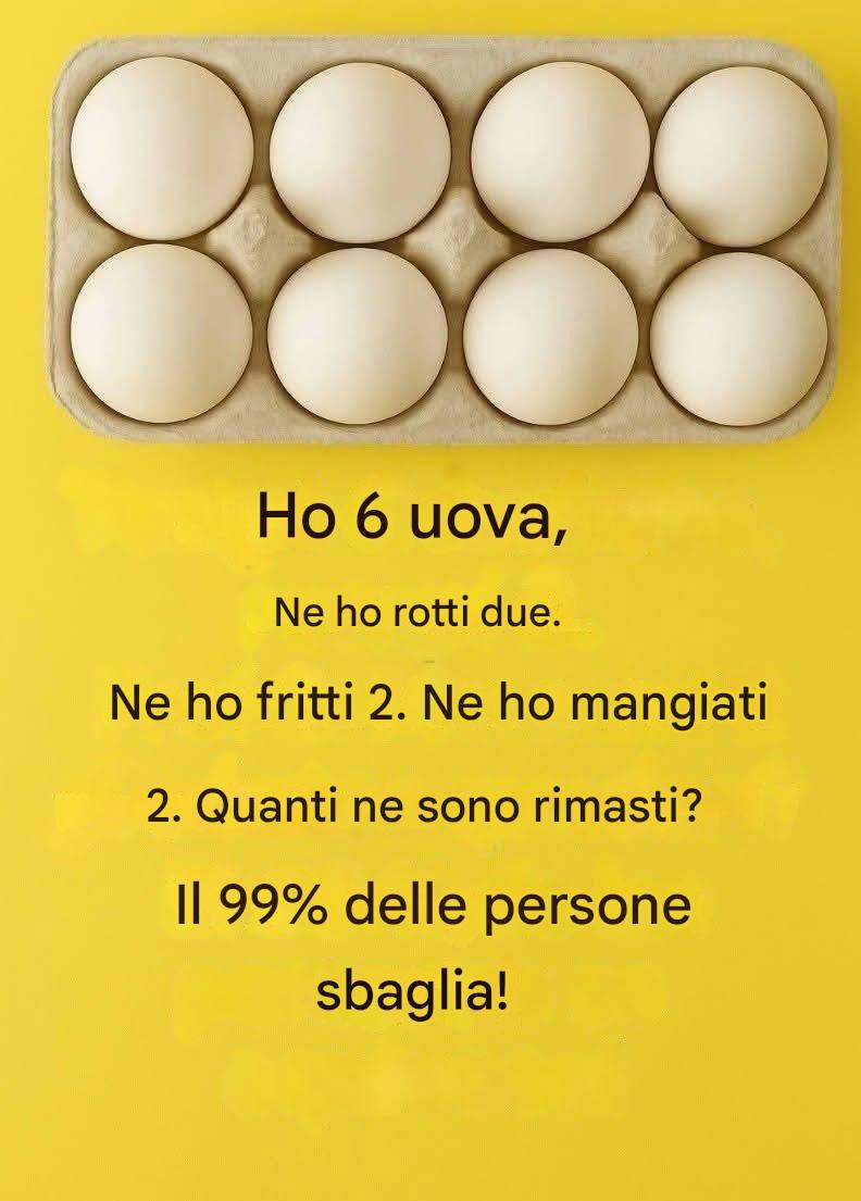 🤯 Ed effettivamente! La maggior parte degli utenti risponde in modo errato senza pensarci. Alcuni dicono che sono rimaste 0 uova, altri 4, altri 2… ma qual è la risposta corretta?