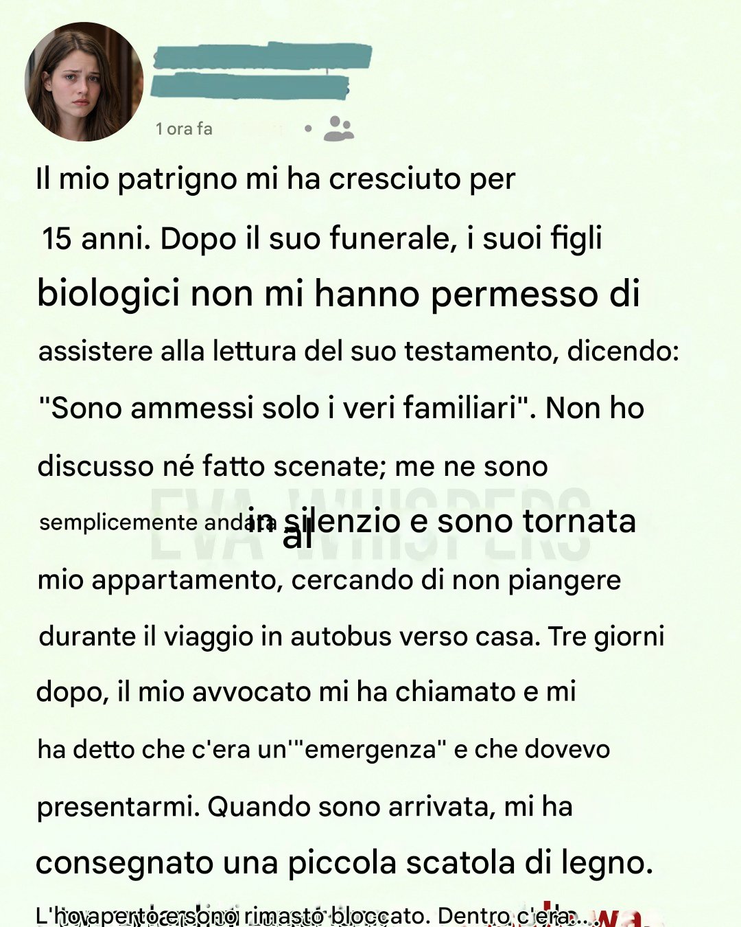 Quando arrivai, l’ufficio era vuoto e silenzioso. L’avvocato mi fece cenno di sedermi e poi scomparve in una stanza sul retro. Quando tornò, teneva in mano una piccola scatola di legno con i bordi smussati.