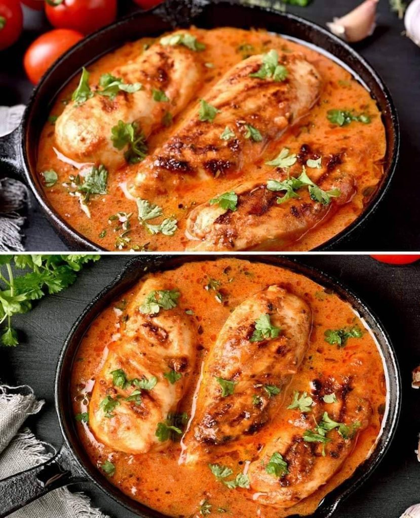 Questo pollo con panna e salsa di pomodoro è carino e ha un buon profumo. Si vede subito che si tratta di un piatto familiare e confortante. Piatto unico e molto consistente.